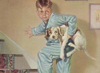 GOOD, Small PRINT OF KID SNEAKING HIS TERRIER DOG TO BED, 5" x 7",