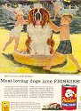 FRISKIES AD WITH KIDS BATHING SAINT BERNARD IN KIDDIE POOL, illustrated