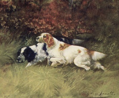 PRINT OF ENGLISH SETTERS, by G. Muss-Arnolt, small, 7" x 5", NOS (unused