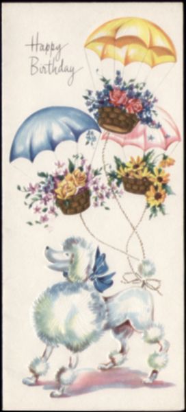 - '60'S BIRTHDAY CARD WITH WHITE POODLE, metallic gold baskets, unused,