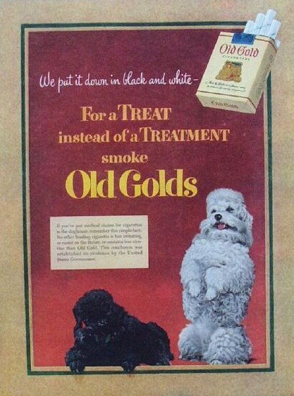 POODLES IN 1952 OLD GOLD AD, looks like they are puppies or else miniature,