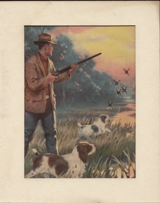 - 30's MATTED PRINT OF ENGLISH AND WELSH SPRINGER SPANIELS HUNTING, with