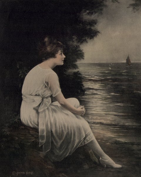 - 1920's ADELAIDE HIEBEL PRINT OF WOMAN WAITING FOR A SHIP, 6 3/4"x 8 3/8",